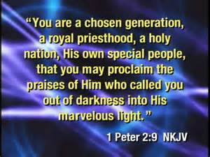 "... for you are a chosen people. You are royal priests, a holy nation, God's very own possession. As a result, you can show others the goodness of God, for he called you out of the darkness into his wonderful light."